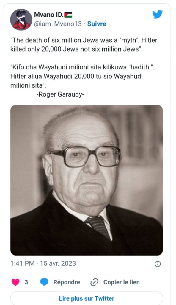 Un compte Twitter « pro-palestinien », avec presque huit mille abonnés, nie l’existence de la Shoah en citant R. Garaudy (condamné pour contestation de crimes contre l’humanité).