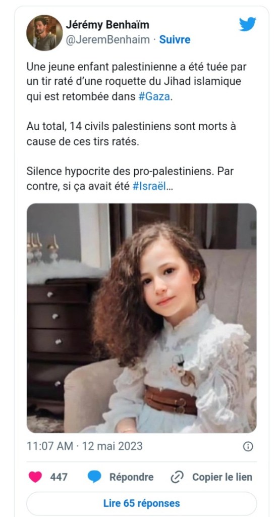 Mais s’ils sont sincères, alors ils doivent préciser que, premièrement, Israël ne bombarde qu’après avoir été lui-même bombardé, et, deuxièmement, qu’au moins 14 civils palestiniens tués l’ont été par des roquettes du Jihad Islamique « Palestinien » mal conçues et qui sont retombées sur Gaza, ou par des explosions accidentelles lors des tirs.