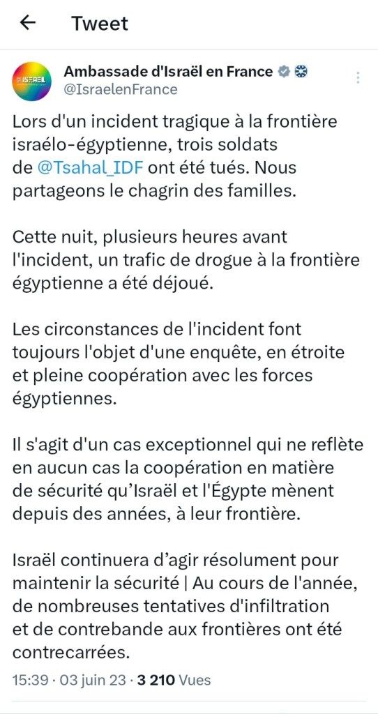 Lors d’un incident tragique à la frontière israélo-égyptienne, trois soldats de Tsahal ont été tués. Nous partageons le chagrin des familles.