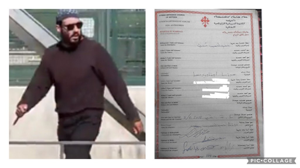 2- En Suède, pas non plus de certificats de baptême ni de célibat, obligatoires pour se marier. Quant à son certificat de mariage le 11/05/2018 (dont les noms de sa femme et de ses parents sont cachés par respect pour leur souffrance), il y a caché sa véritable identité.