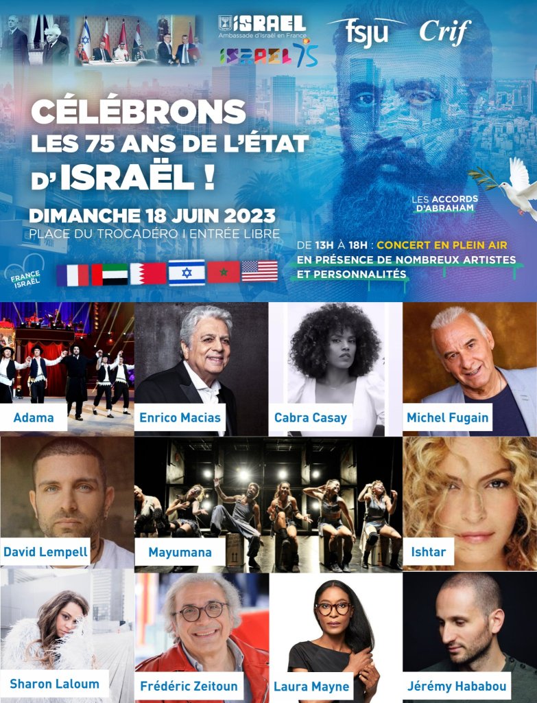 Les 75 ans d’Israël sont fêtés ce dimanche à Paris, place du Trocadéro. Organisé par le FSJU et le Crif, avec le concours de l’Ambassade d’Israël en France.