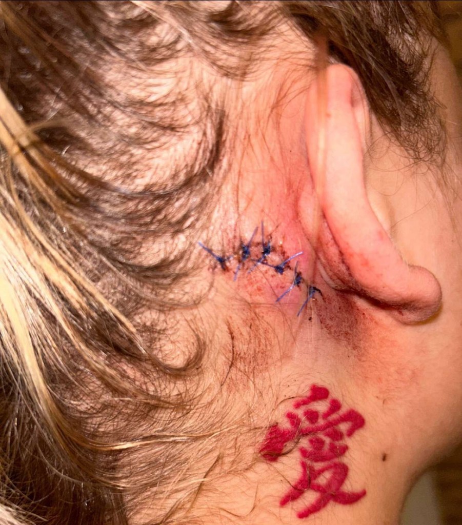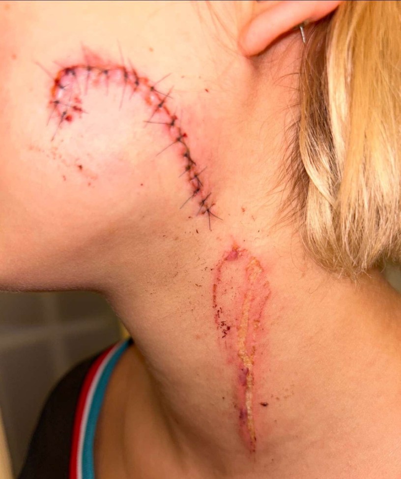 La jeune femme atteinte au visage à coups de tesson de bouteille. Elle a publié des photos de ses blessures sur son compte Twitter.