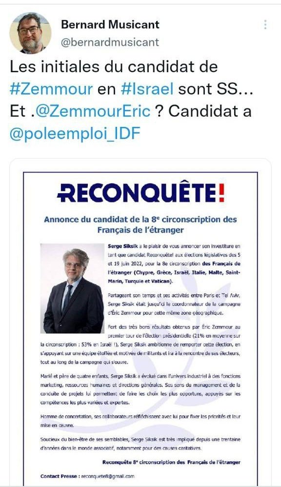 Serge Siksik, a été choisi par le parti Reconquête pour être candidat dans la 8e circonscription des Français de l’étranger (Israël, Chypre, Grèce, Italie, Malte, Saint-Marin, Turquie et Vatican) pour les élections Législatives en 2022.
