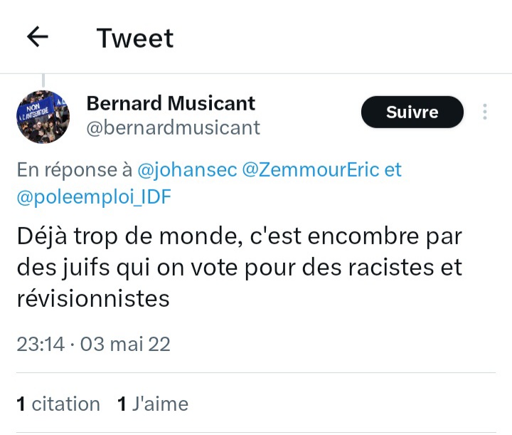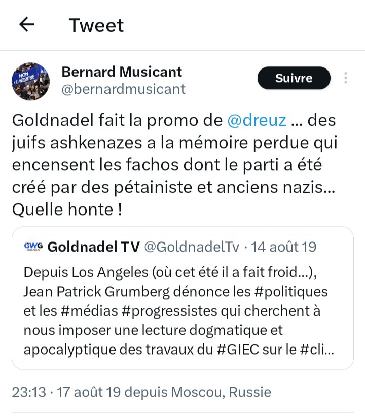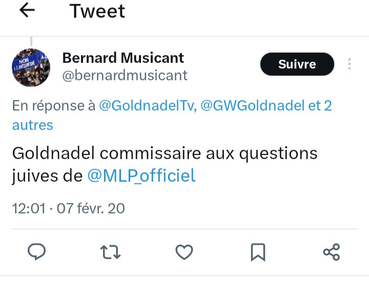 J’affirme aussi qu’un proche du CRIF, il se nomme Bernard Musicant est un délateur, il a diffusé sur les réseaux sociaux la tête d’un militant juif de droite en pâture aux islamistes. Bernard Musicant emploi des méthodes crapuleuses pour faire taire une personne pour la réduire au silence, une sorte de chantage d’intimidation.